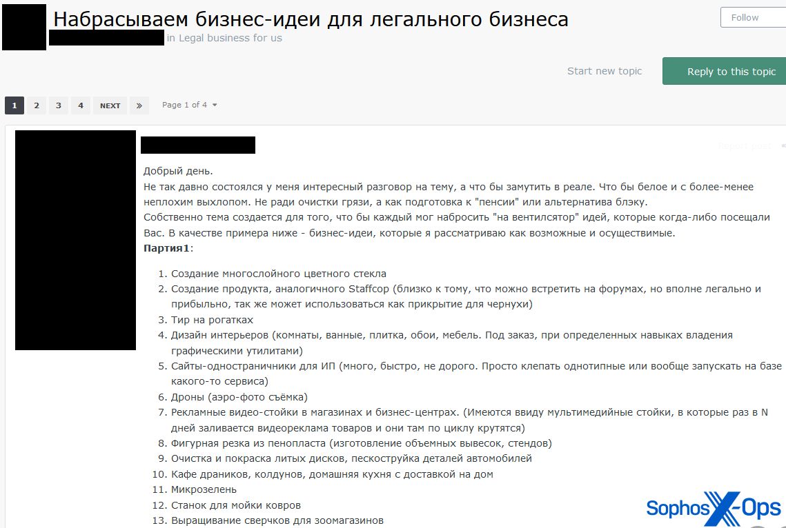 We saw several proposals and pre-existing businesses relating to restaurants, including a proposal to start a food delivery business during the COVID-19 pandemic. One user (somewhat ironically, given their membership of a criminal forum), noted that “it is a question of internal ethics whether to make money from an epidemic.”