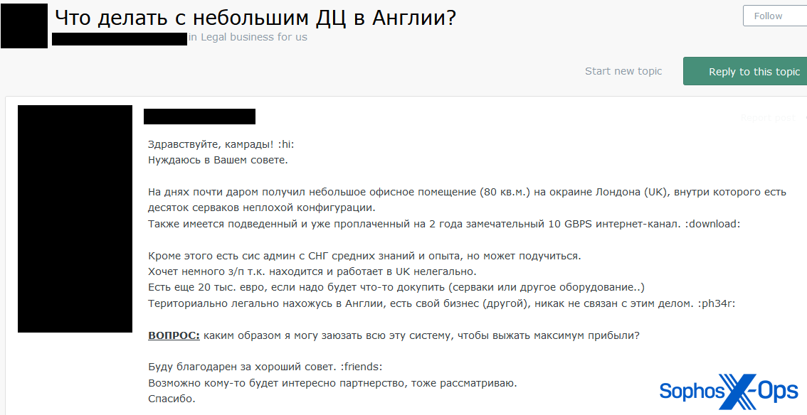 Figure 12: A thread in which a threat actor sought business ideas and possible partnerships for office space “on the outskirts of London,” complete with a “10 GBPS Internet channel”
