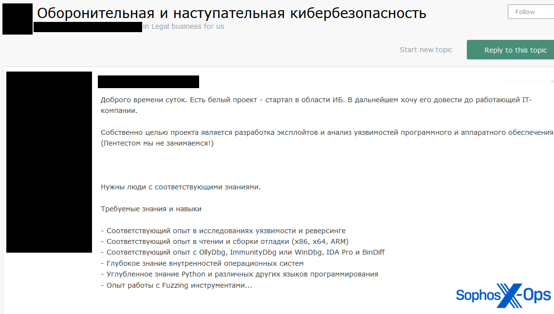 Figure 7: A threat actor promotes their cybersecurity start-up on a criminal forum, and notes that they are seeking “people with relevant knowledge” in vulnerability research, debugging, coding, and fuzzing