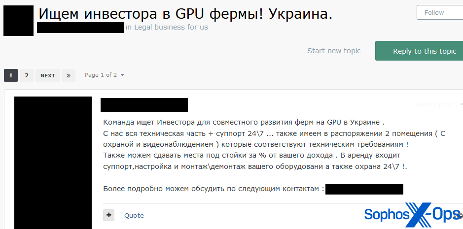 Figure 11: A threat actor looks for investment for the development of GPU farms in Ukraine (posted prior to the Russian invasion of Ukraine in 2022)