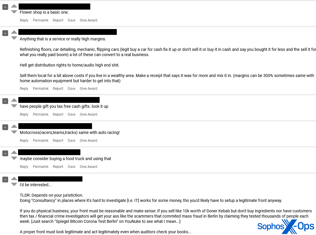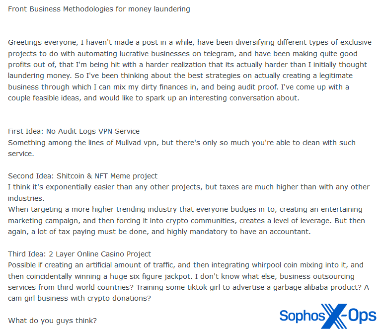Figure 15: A threat actor posts several suggestions for “legitimate business[es] which I can mix my dirty finances in”