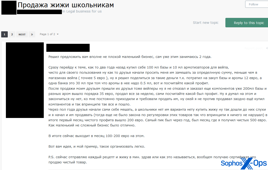 A threat actor noted that for the last two years they have been selling e-liquid to schoolchildren, making 100-200 Euros per month. Another user (and remember that this is on a criminal forum) expressed outrage: “I’m reading this as a parent…don’t you fucking have children?”).