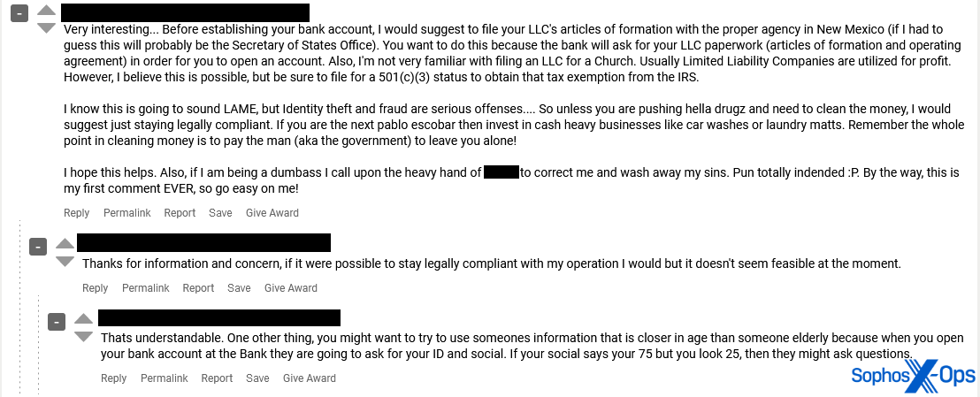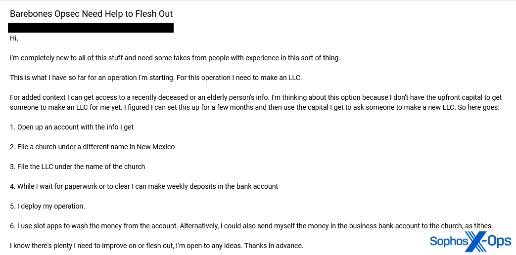 Figure 38: A threat actor seeks OPSEC advice for creating an LLC under the name of a church in New Mexico. Note that while setting up an LLC is of course not illegal in itself, the proposed scheme here appears to be explicitly criminal (note the stated aim to “wash the money”)