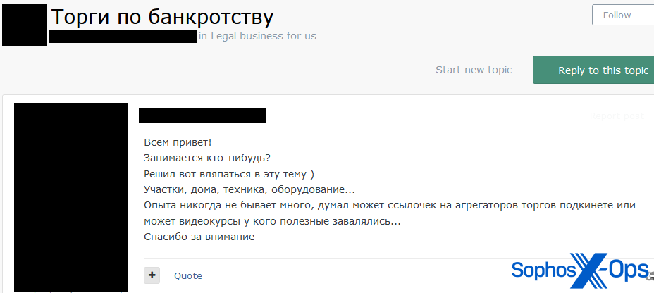 Figure 36: A threat actor decides to get involved in bankruptcy auctions, and asks their peers for “links to bidding aggregators or maybe someone might have some useful video courses”