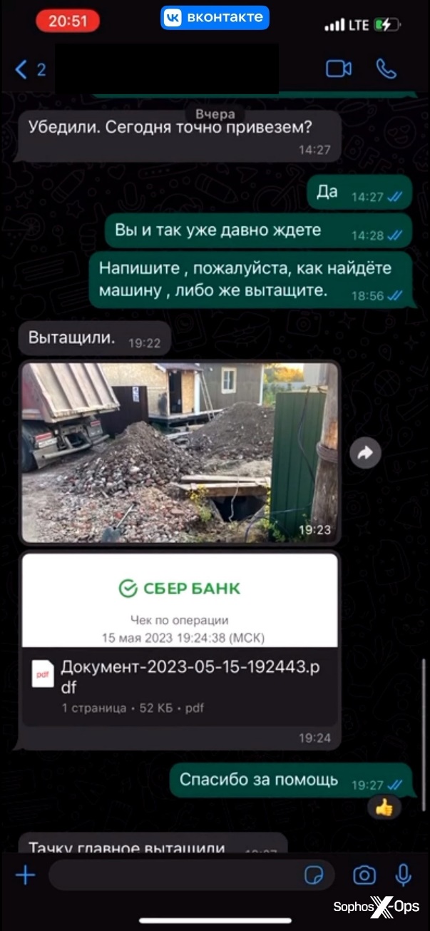 Figure 28: One of several WhatsApp screenshots in a thread on “making money from building materials.” Note the photograph of a location, and an attached bank transfer confirmation (the user also posted a separate screenshot of this). While some of the information in the bank transfer confirmation was redacted, it still featured some potentially useful information, including the amount and the date and time