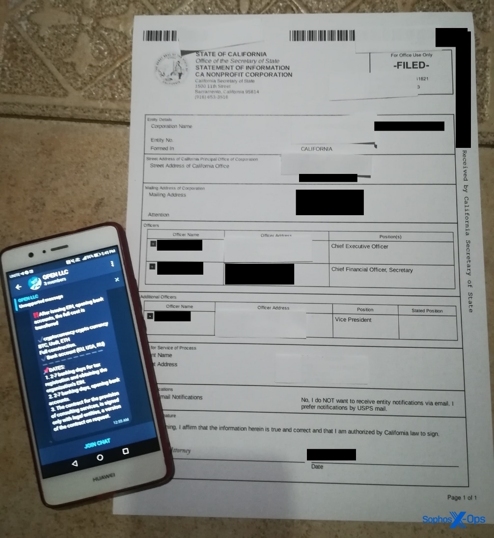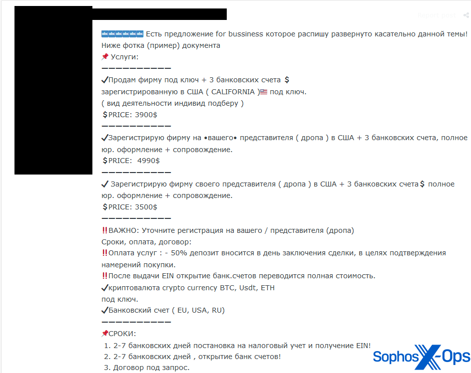 One threat actor posted an advert offering to sell three US-based ‘turnkey’ companies and bank accounts ($3900), or register a new US company and three bank accounts under a buyer’s representative ($4990) or their own representative ($3500). This post was accompanied by a photograph of a State of California Statement of Information for a Non-Profit Corporation. The threat actor obscured some details, but some names, addresses, and a document reference number were still visible.