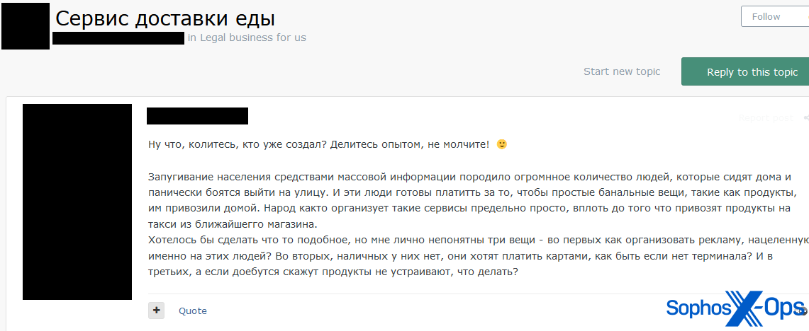 Figure 30: A threat actor proposes starting a food delivery business during the COVID-19 pandemic, and seeks business advice from their peers