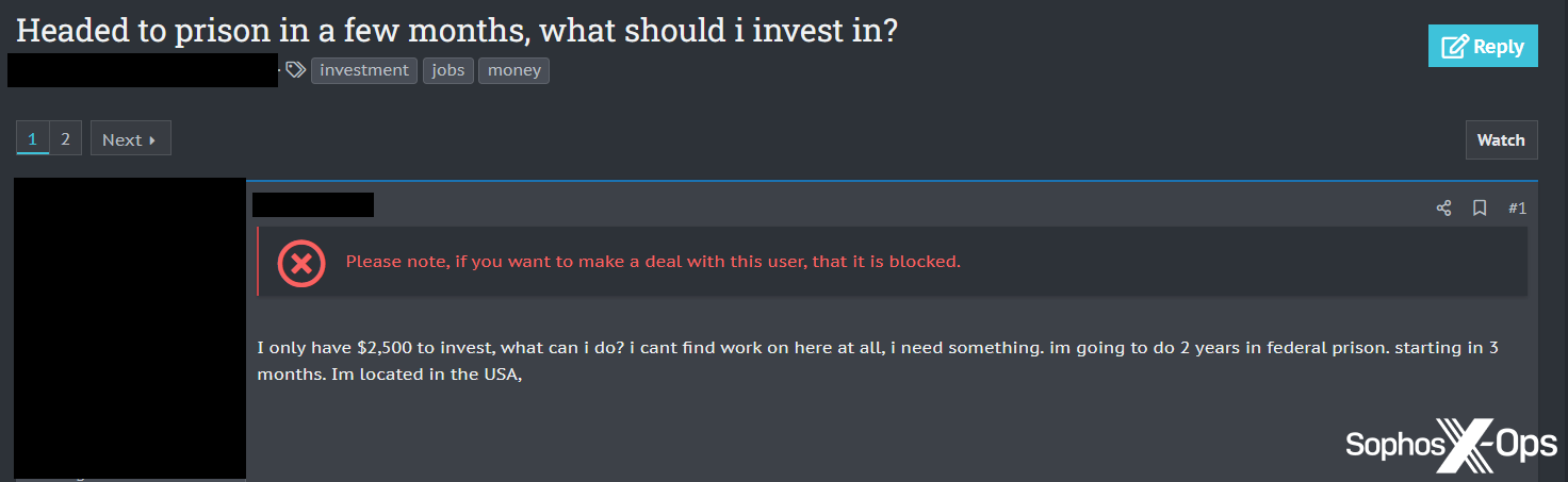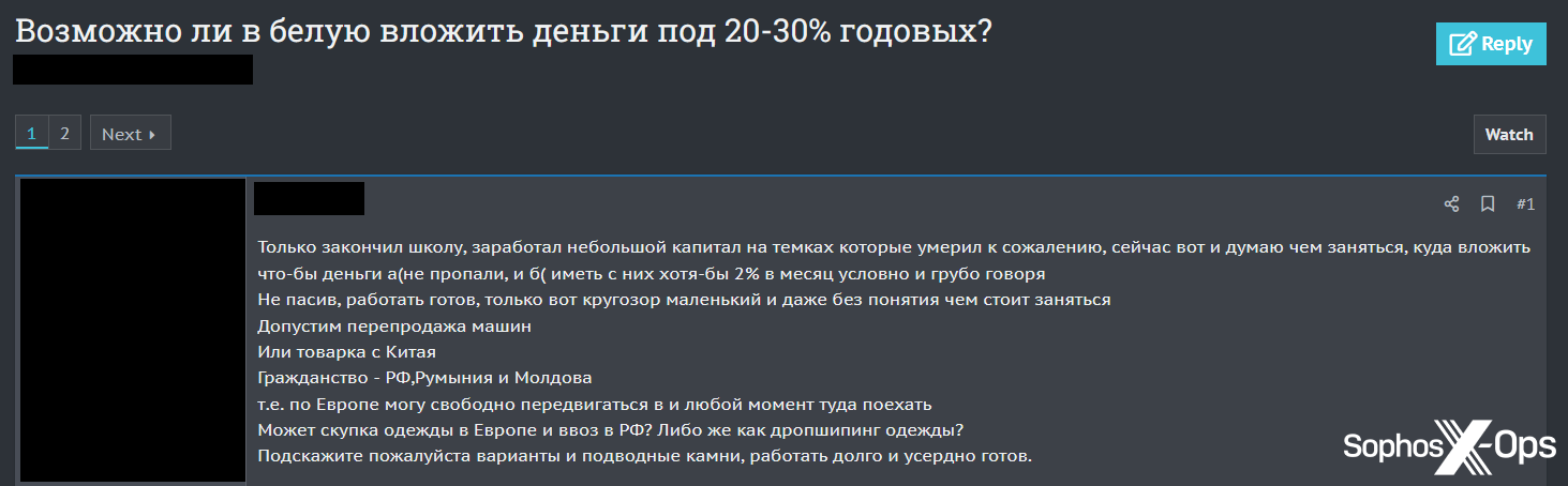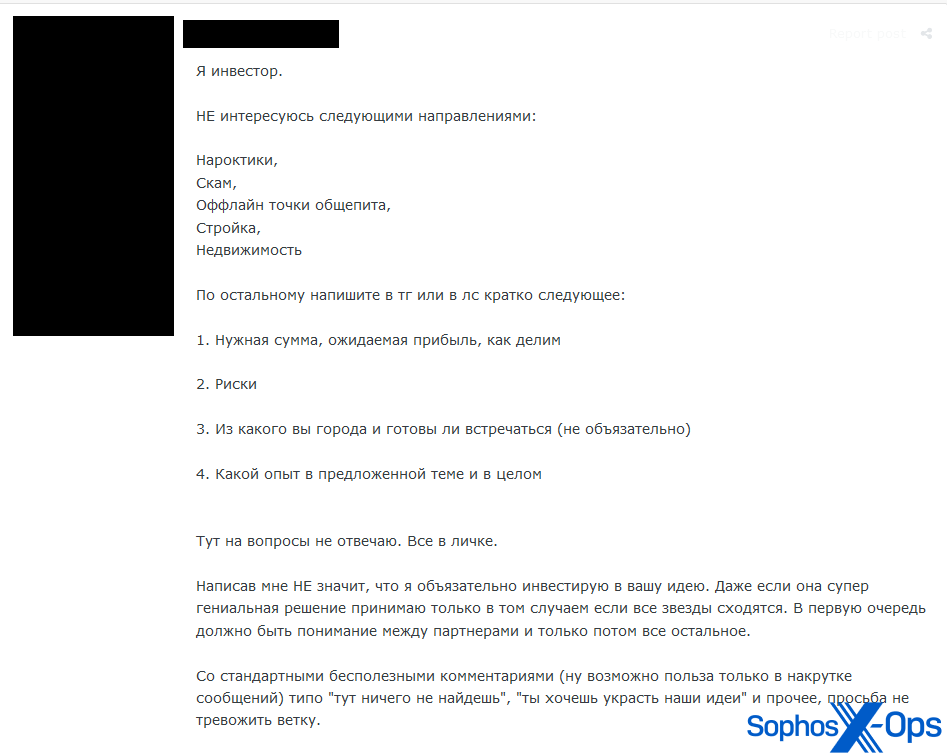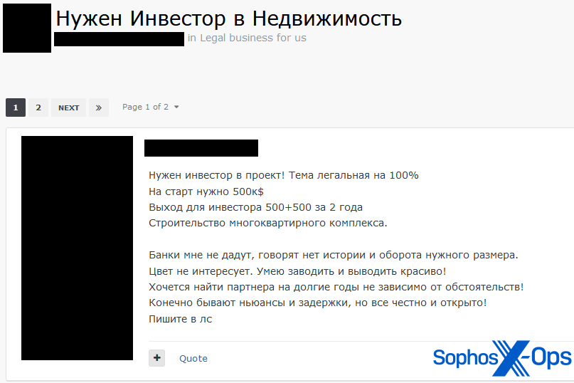 An investment opportunity ($500,000; ROI: double in two years) in an apartment complex project. Apparently the user could not get a loan from the bank, so they turned to a cybercrime forum (“I don’t care about color [i.e., if the money is from ‘white’, ‘grey’, or ‘black’ activities], I can start it up and get it out beautifully”).