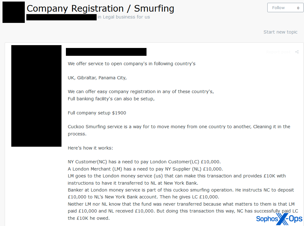 We also observed a service offering to open companies in the UK, Gibraltar, and Panama ($1900) to facilitate a technique called “cuckoo smurfing,” which involves insiders in money services intercepting legitimate transactions and mixing them with illicit ones.