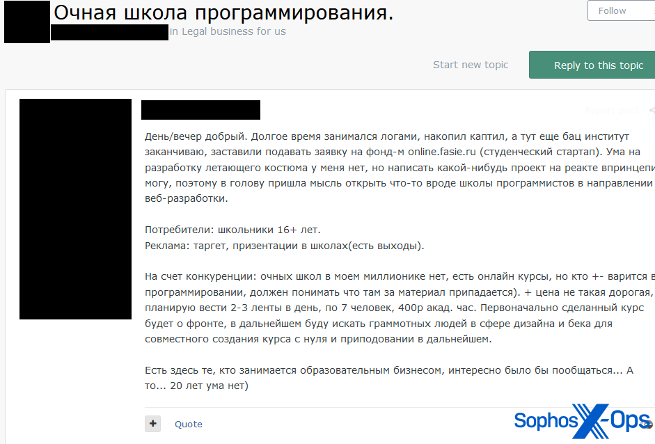 A threat actor who “worked on logs for a long time, accumulated capital” (i.e., they profited from infostealers) had an idea to open “a programmer school in the direction of web development,” aimed at 16-year-olds. The user noted that there is little competition and “no in-person schools in my million-plus population”, and proposed charging students 400 rubles per academic hour.