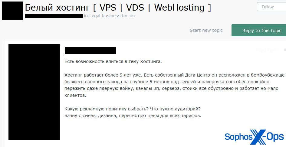 We also saw a thread referring to a pre-existing, five-year-old hosting company with its own data center, “located in a bomb shelter of a former military plant at a depth of 5 meters underground…everything is equipped and working, but there are few clients.”