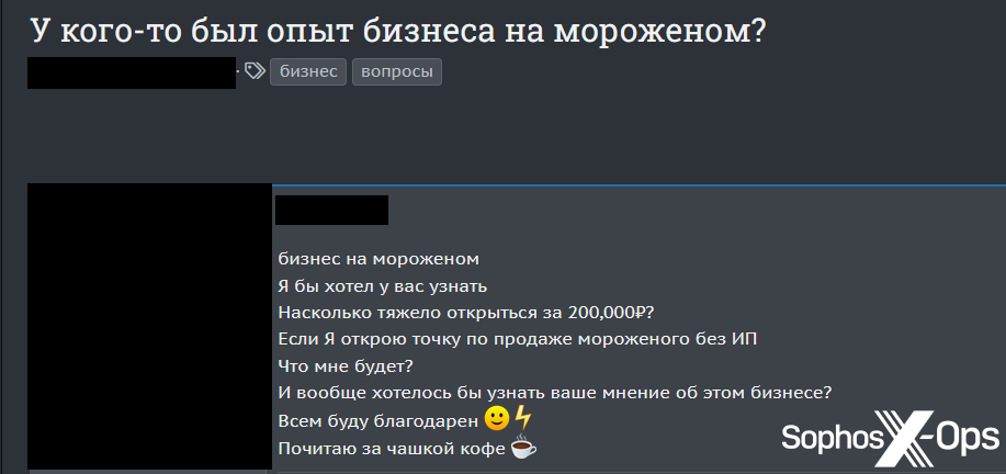 Of all things, we noted a threat actor who wanted to launch an ice cream business. They asked others whether it would be feasible to open a stall with 200,000 rubles.