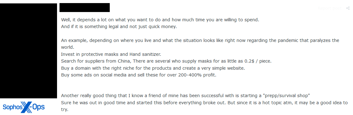 Figure 42: A threat actor suggests reselling protective masks and hand sanitizer at the height of the COVID-19 pandemic