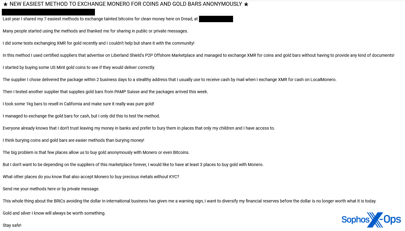 Figure 17: A threat actor (the same user who previously admitted to bribing homeless people with money or drugs to get them to open bank accounts, in Part One) describes a method for exchanging Monero for coins and gold bars