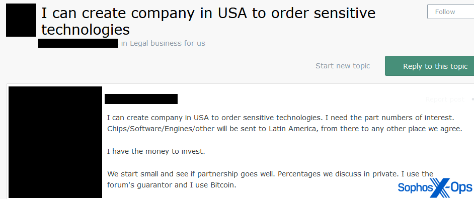 Another user said that they could create a US-based company to order “sensitive technologies.” The user stated that “chips/software/engines/other will be sent to Latin America, from there to any other place we agree.”