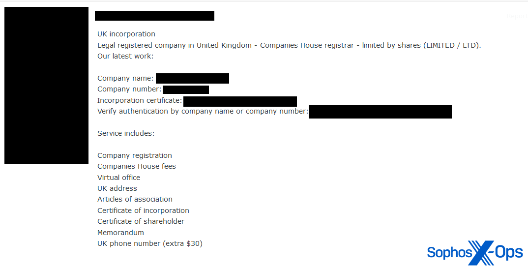 This threat actor provided an example of a company which they claimed to have registered, including the name and company number. According to the user, the service includes a virtual office, a UK address, articles of association, certificate of incorporation, and a UK phone number.