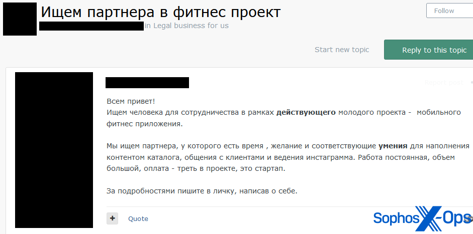 Figure 9: A threat actor seeks a partner to work on a new mobile fitness app; the work includes “communicat[ing] with clients and maintain[ing] Instagram…the payment is a third of the project, this is a startup”