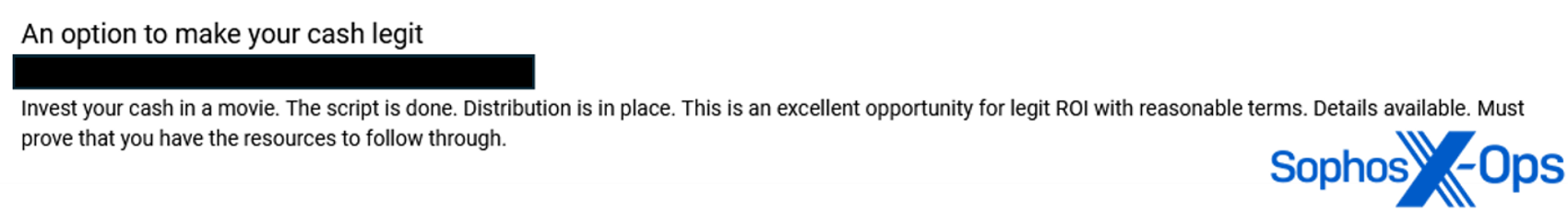 We observed a proposal to invest cash in a movie with a “legit ROI with reasonable terms.”