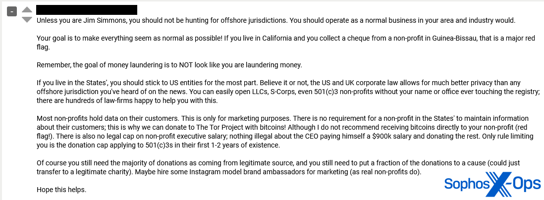 Figure 40: A user provides technical advice on setting up a non-profit for money laundering