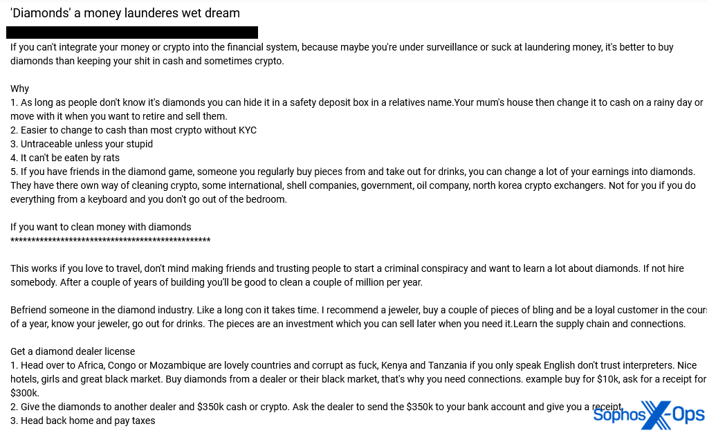 One threat actor noted that diamonds can be changed to cash, can be hidden in a safety deposit box in a relative’s name, and are untraceable (“unless your [sic] stupid.”).