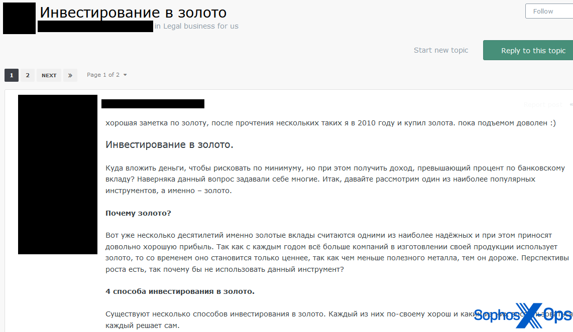 The threat actor noted that the optimal solution for most investors is to open a gold deposit in a bank, and shared several (Russian) links.