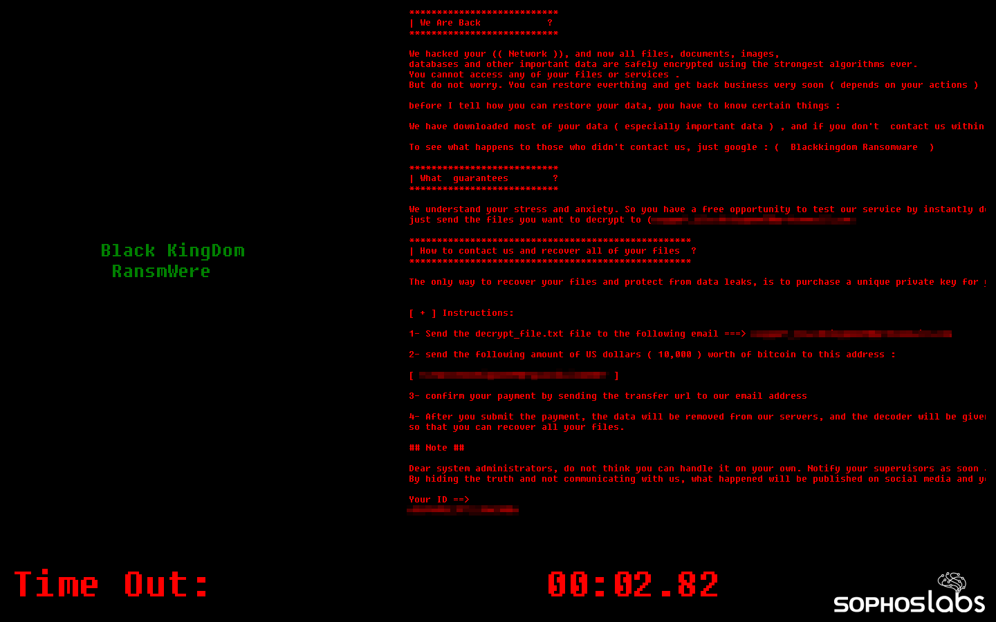 The Black KingDom ransomware is far from the most sophisticated payload we’ve seen. In fact, our early analysis reveals that it is somewhat rudimentary and amateurish in its composition, but it can still cause a great deal of damage. It may be related to a ransomware of the same name that appeared last year on machines that, at the time, were running a vulnerable version of the Pulse Secure VPN concentrator software.