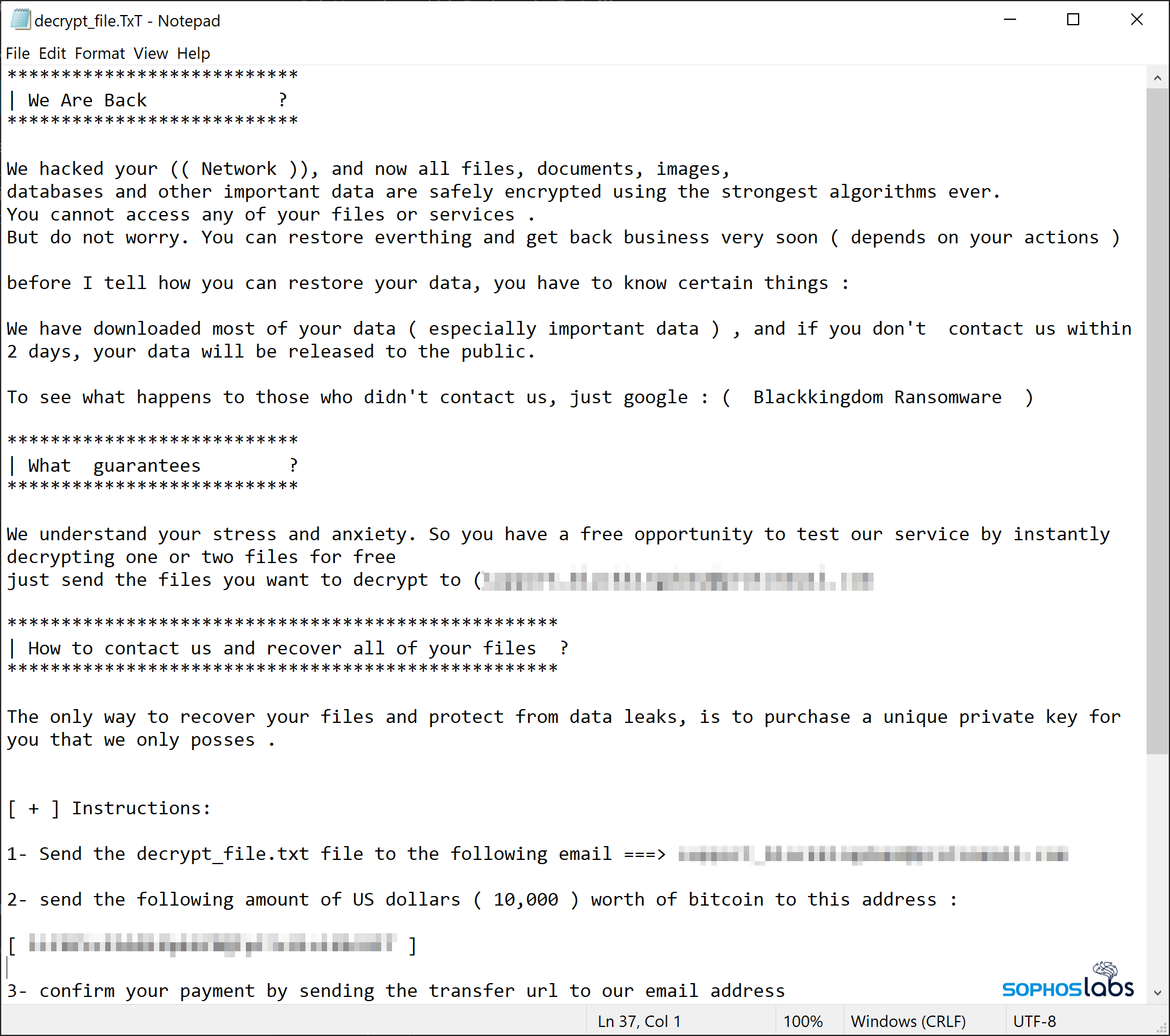 Alongside the encrypted data a ransom note is stored in a file named decrypt_file.TxT: