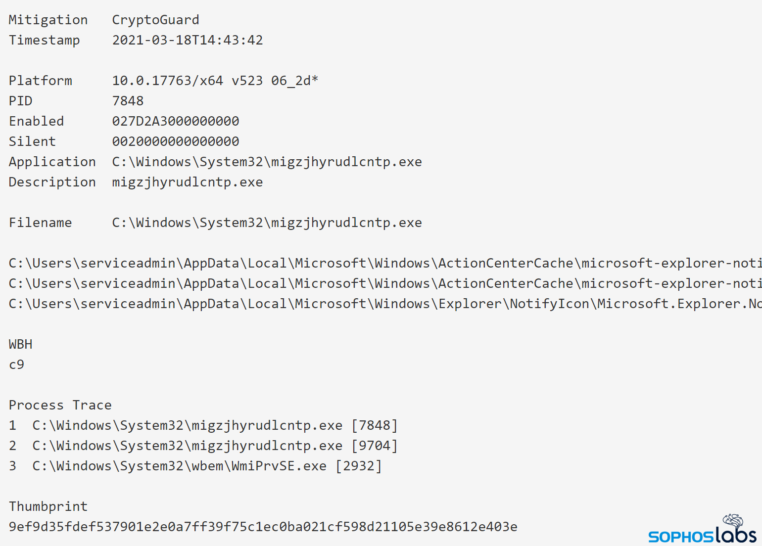 Our CryptoGuard protection caught the ransomware attempting to encrypt data. Below, raw telemetry from our signature-agnostic technology shows the ransomware binary being executed via WMI as documented above (read the Process Trace sequence backwards, from 3 to 1):