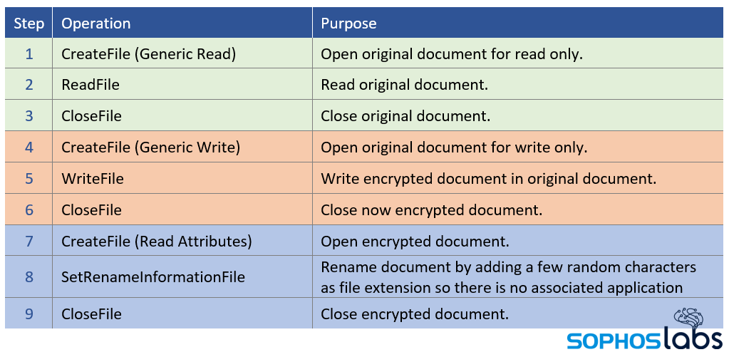 The file system behavior of the file encryption function is straightforward: Read (original) > Overwrite (encrypted) > Rename: