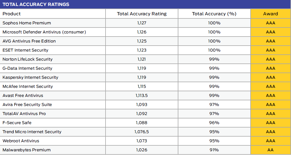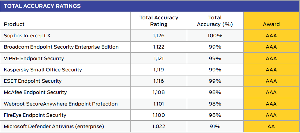Sophos Intercept X was the only product tested to achieve a 100% total accuracy rate, once again earning a AAA rating from SE Labs. You can view the full enterprise test results here.