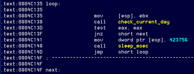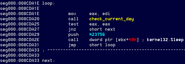 The code snippets below demonstrate that the 423,756-millisecond delay specified within /bin/snort executable is identical to its Windows counter-part: