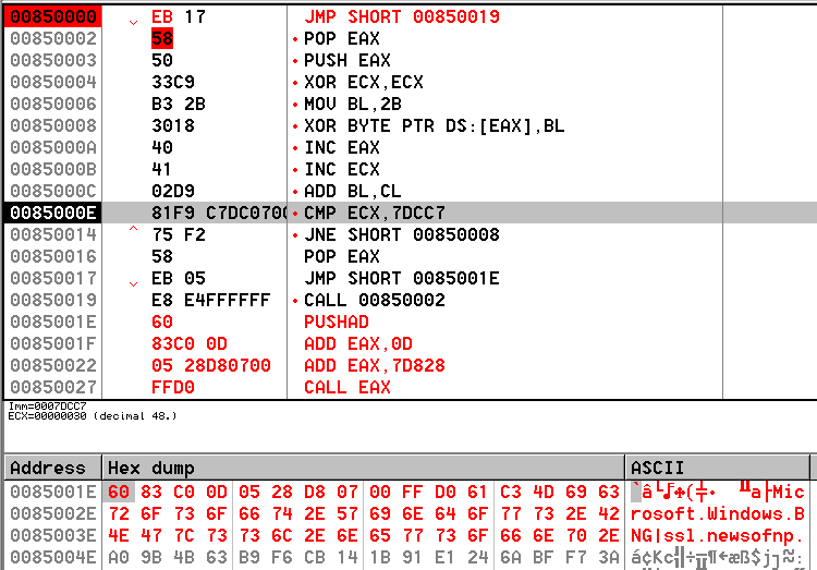 The initial shellcode will then decrypt the rest of the blob, using an XOR key that starts from 0x2B, and then incremented by the index of the decrypted byte, i.e. the XOR key values are: 0x2B, 0x2C, 0x2E, 0x31, etc.