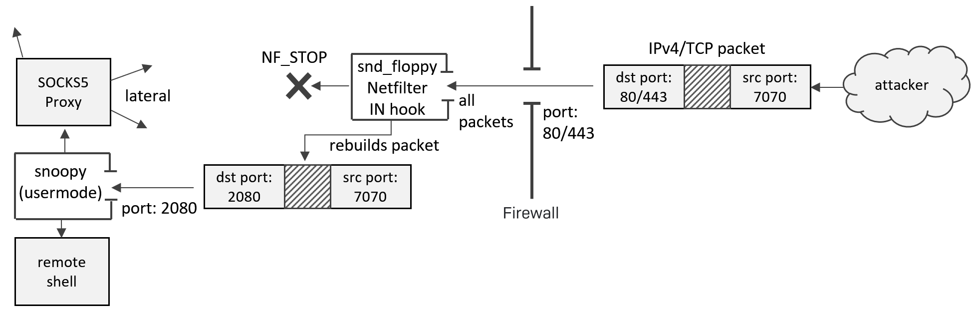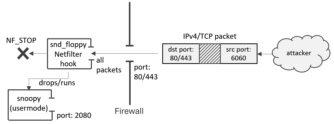 The central piece of the attack is a file named snd_floppy – a kernel module that sets up a network packet filter, using a Netfilter hook (NF_INET_LOCAL_IN and NF_INET_LOCAL_OUT).