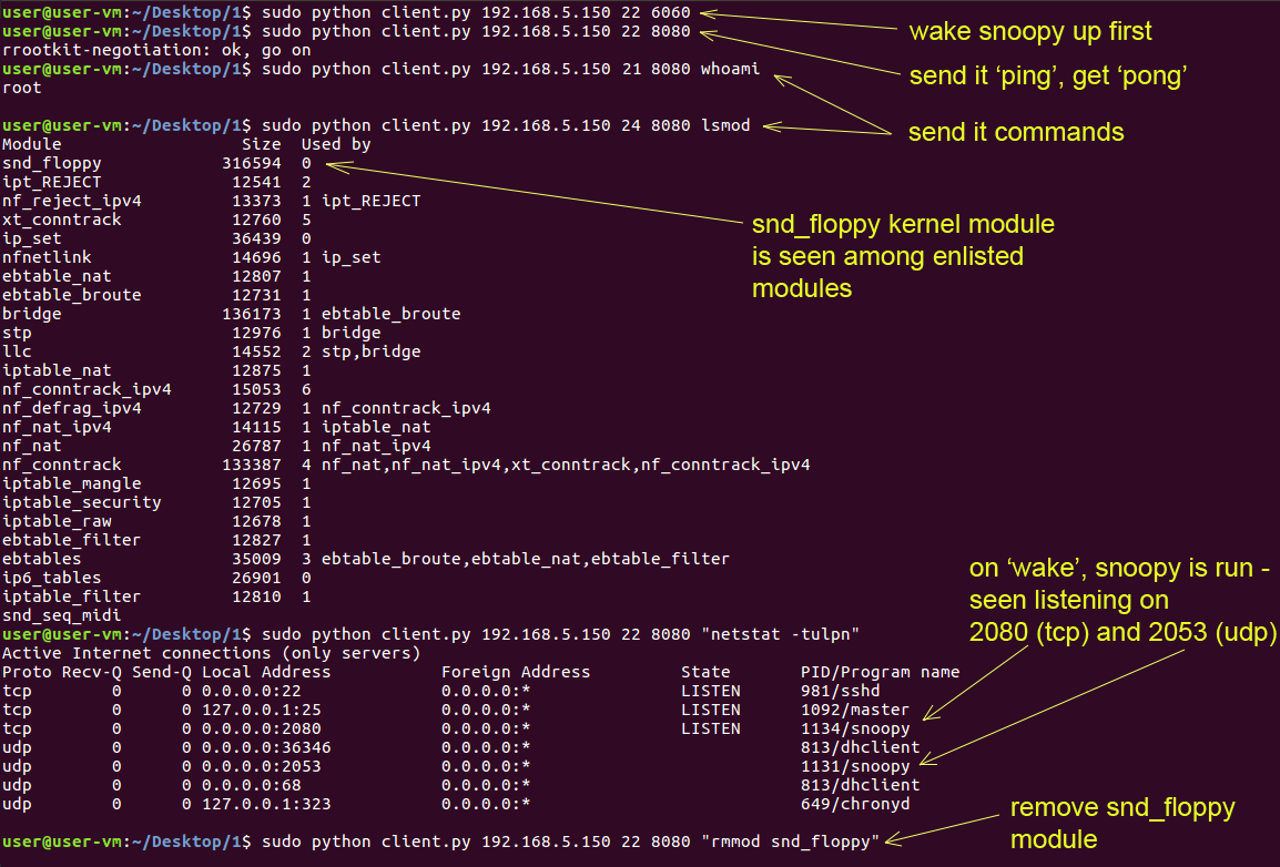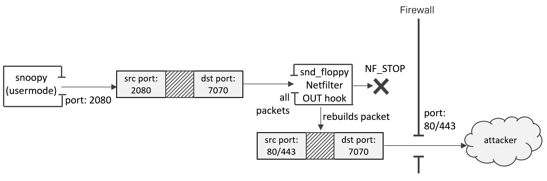 Hence, the ultimate purpose of the snd_floppy rootkit is to provide a covert control channel for the snoopy usermode process, running on a compromised host.