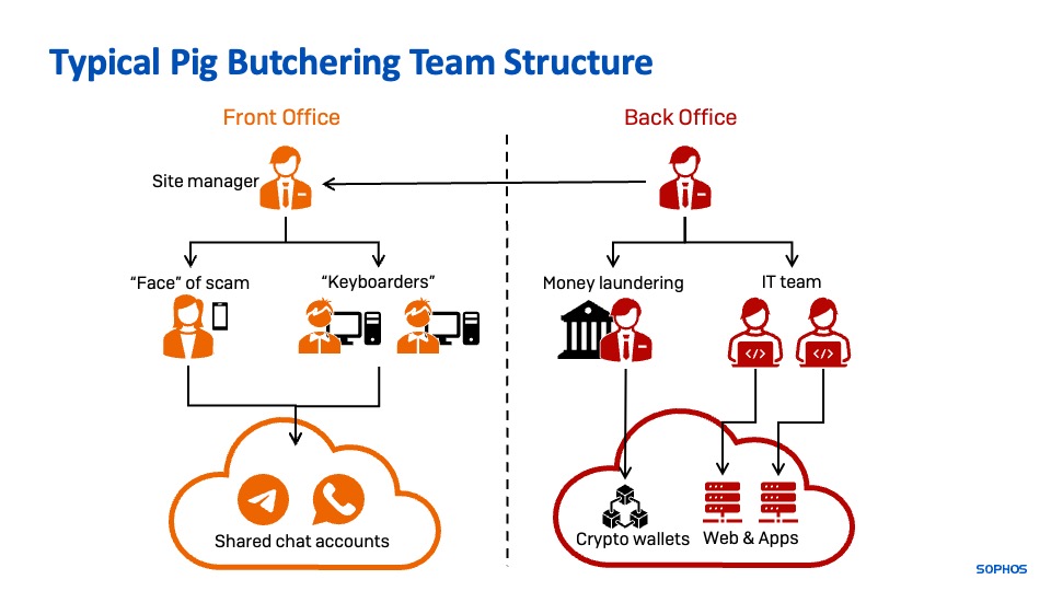 Depending on the organization behind the scam, pig butchering style organizations are broken into distinct parts, with distinct sets of tools. There is a “front office” (the “customer” facing operation that lures, engages and instructs victims) and a “back office” (IT operations, software development, money laundering and accounting). These operations may be co-located geographically, but they are often widely dispersed, with the back office team spread out internationally.