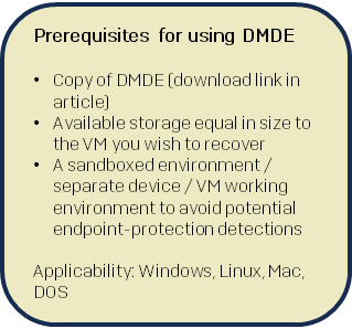 A beige text box that says "Prerequisites for using DMDE: Copy of DMDE (download link in article), Available storage equal in size to the VM you wish to recover, A sandboxed environment / separate device / VM working environment to avoid potential endpoint-detections. Applicability: Windows, Linux, Mac, DOSWhen dealing with a partially encrypted virtual disk, DMDE can locate and identify accessible sectors of data that remain unencrypted. It allows users to manually inspect and recover file structures, including directories and files within recognized file systems, using its hex editor and partition manager.