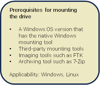 A callout box with the following text: Prerequisites for mounting the drive A Windows OS version that has the native Windows mounting tool Third-party mounting tools Imaging tools such as FTK Archiving tool such as 7-Zip Applicability: Windows, LinuxJust because you have been told that the VM is encrypted doesn’t necessarily mean that it is. (Yes, cybercriminals sometimes lie.) We have encountered clients who have mistakenly thought their files were encrypted when, in fact, the attacker had simply changed the file extensions. In addition, we have seen instances where attackers’ encryption processes have failed and actually just renamed the file.