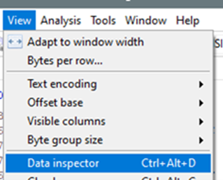 Figure 11: The View dropdown in HxD with the Data inspector option selected