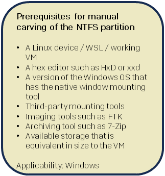 Callout box with following text: Prerequisites for manual carving of the NTFS partition A Linux device / WSL / working VM A hex editor such as HxD or xxd A version of the Windows OS that has the native window mounting tool Third-party mounting tools Imaging tools such as FTK Archiving tool such as 7-Zip Available storage that is equivalent in size to the VM Applicability: WindowsIn contrast to the tools and techniques summarized above, manual carving takes preparation and some finer understanding of the options available to you. We’ll make some recommendations for how to plan your effort, and then walk you through the specifics of working with dd, the powerful Linux utility you’ll use for this work.