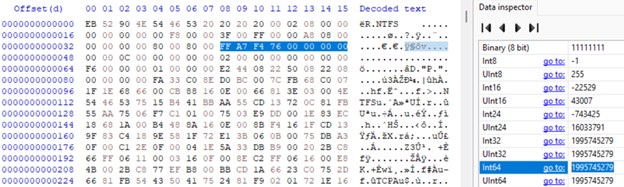 Highlight the next eight bytes, all the way to column 15, as shown (so, bytes 41-48). The value that is shown in INT64 in the data interpreter is the count value – in the figure above, 1995745279. This value is in sectors, and the above command needs it in sectors, so no conversion is needed – note the value and you’re done.