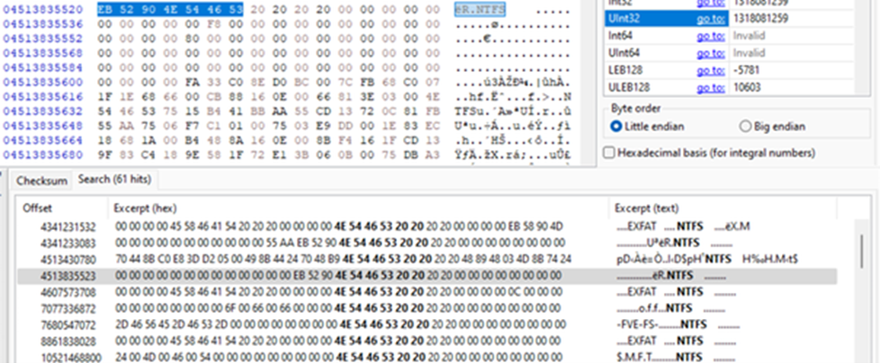 Figure 12: Seeking the hex string that indicates the start of an NTFS sector