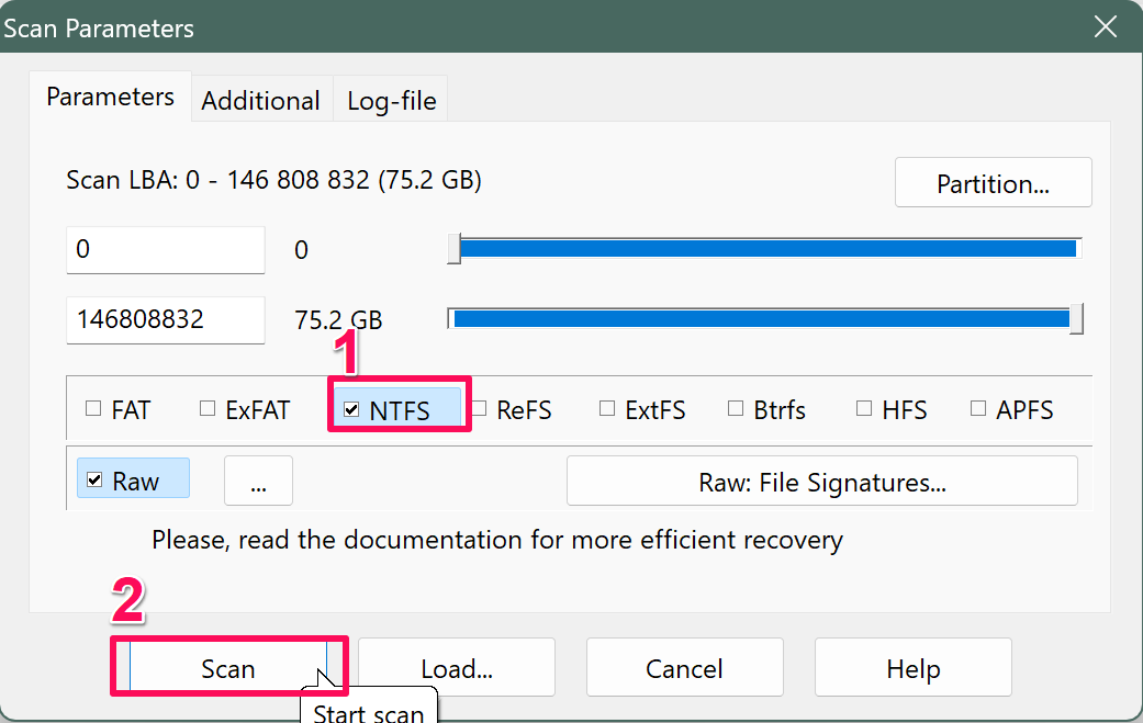 In the Scan Parameters window that opens next and is shown in Figure 3, ensure that the correct file-system formet (for example, NTFS if attempting to recover a Windows machine) is selected. Click Scan.