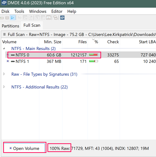 Once the recovery process is completed, click on the largest recovered volume (note the difference in its status bar between Figure 4 and Figure 5) and click Open Volume.