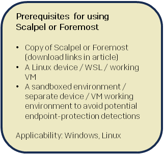Callout box with following text: Prerequisites for using Scalpel or Foremost Copy of Scalpel or Foremost (download links in article) A Linux device / WSL / working VM A sandboxed environment / separate device / VM working environment to avoid potential endpoint-protection detections Applicability: Windows, LinuxTurning our attention from EVTX-recovery tools back to those designed to restore other types of files, Scalpel and Foremost are two of many free file recovery tools currently available. (We covered another one, DMDE, separately in Method 2.) Though both are older tech, the Sophos IR team has had excellent results with these two in our investigations.