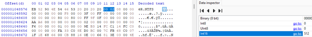 Working from the start of the NTFS partition you have selected, highlight the bytes at offset 11 and 12, as shown in Figure 15. The value shown as Int16 in the data inspector is the value needed. In this example, the bs value is 512. (This value will almost always be 512. Almost.)