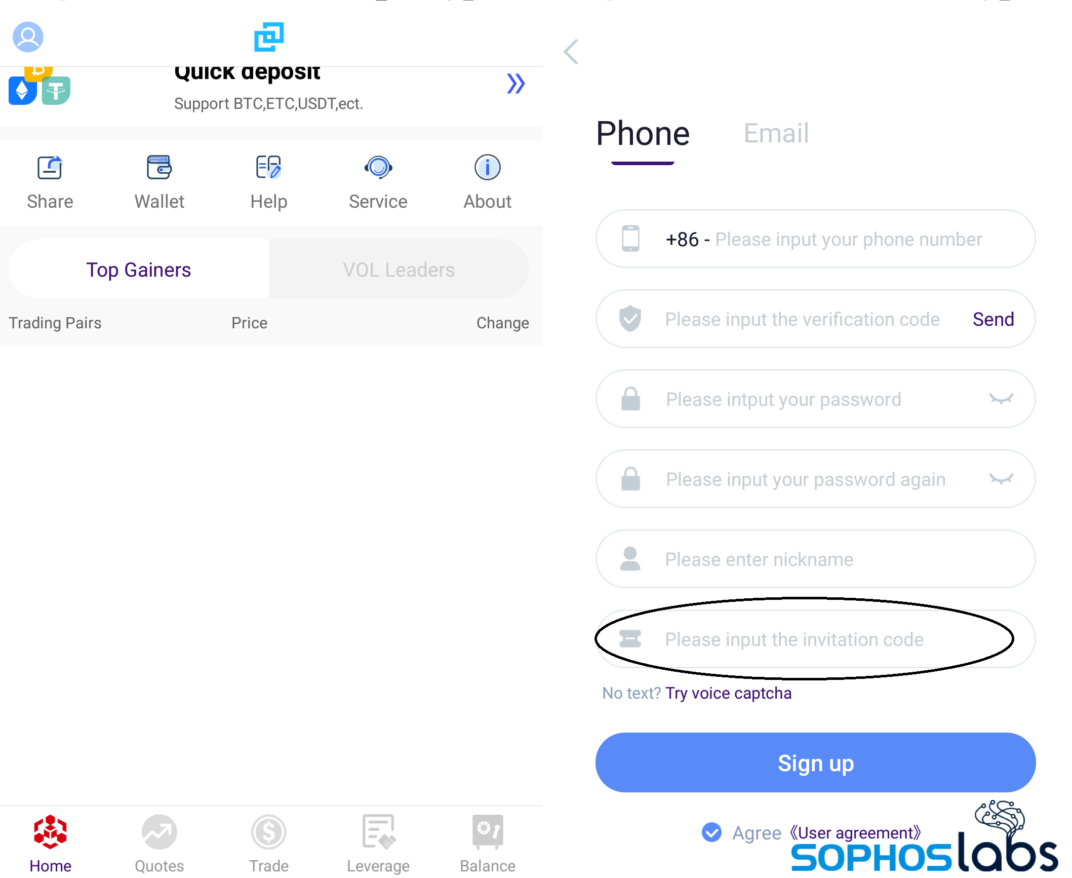 If the user completes the process of installing and launching the app, the user is asked to create an account—and in some cases, the app request an invitation code, possibly to restrict app access to those who were intentionally targeted.