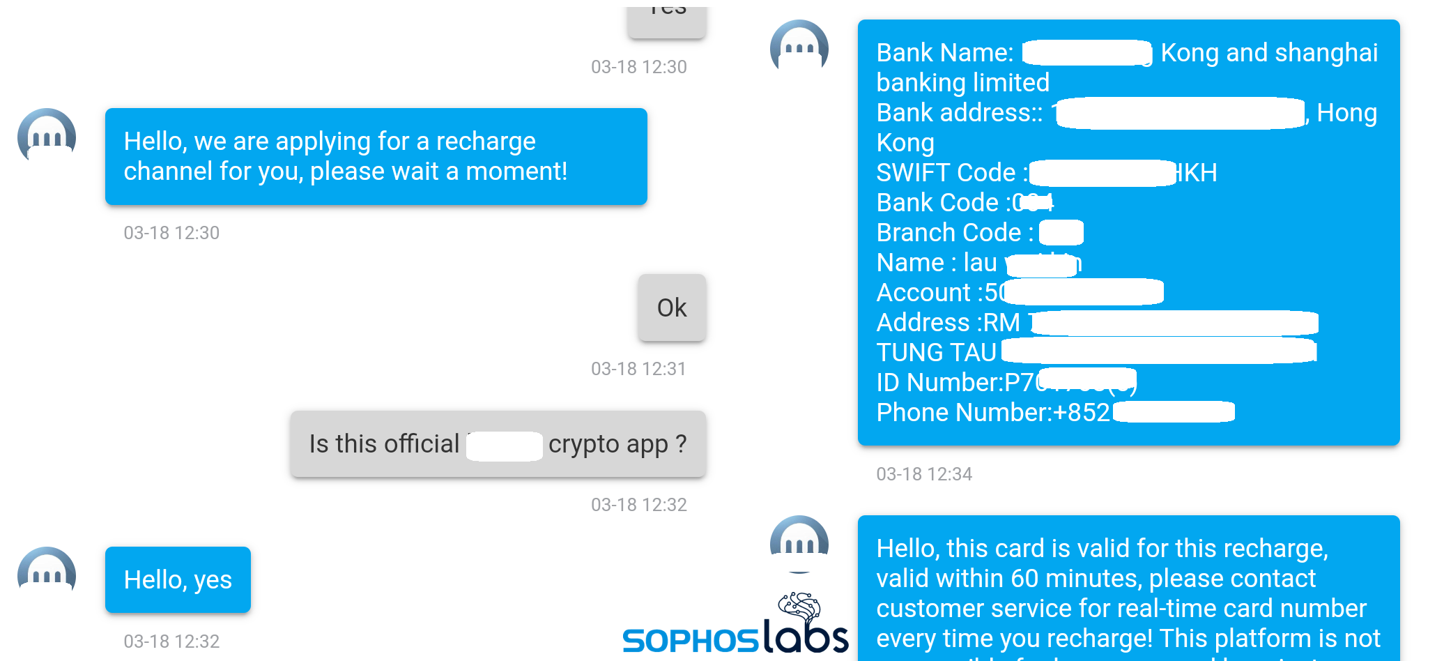 When asked to deposit money, we were given details of the recipient bank accounts based in Hong Kong. This looked like an individual account to which money was to be transferred using wire transfer. The bank details were different at various times, though all were based in Hong Kong.