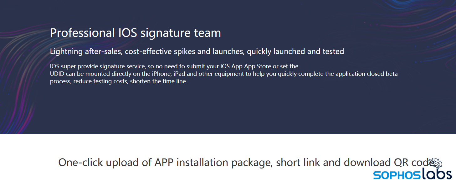 While many of these Super Signature developer services may be targeted at helping legitimate small app developers, we found in our investigation that the malware used many such third-party commercial app distribution services. These services offered options for ‘One-click upload of App Installation’ where you just need to provide the IPA file. They advertise themselves as an alternative to the iOS App Store, handling app distribution and registration of devices.
